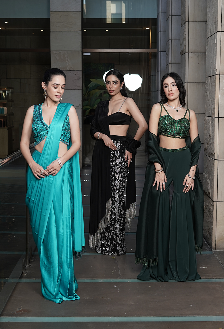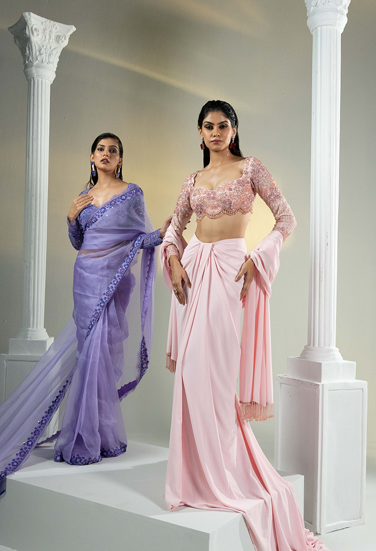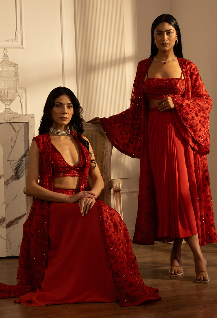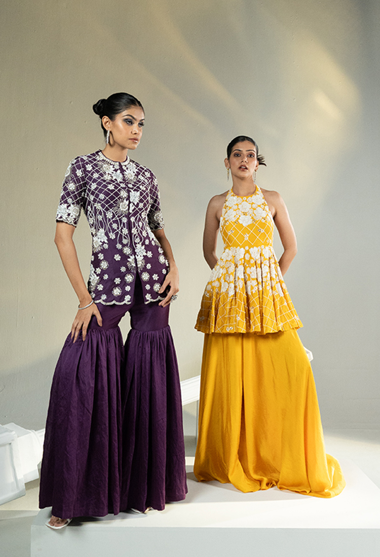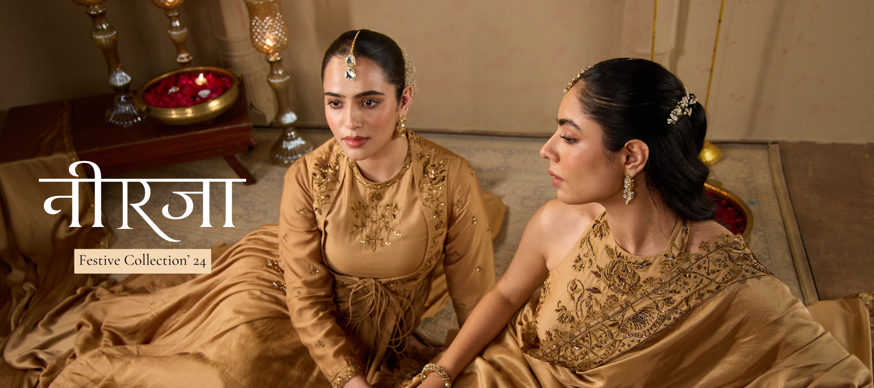 Tangerine micro pleated anarkali set with fine golden zari embroidery
